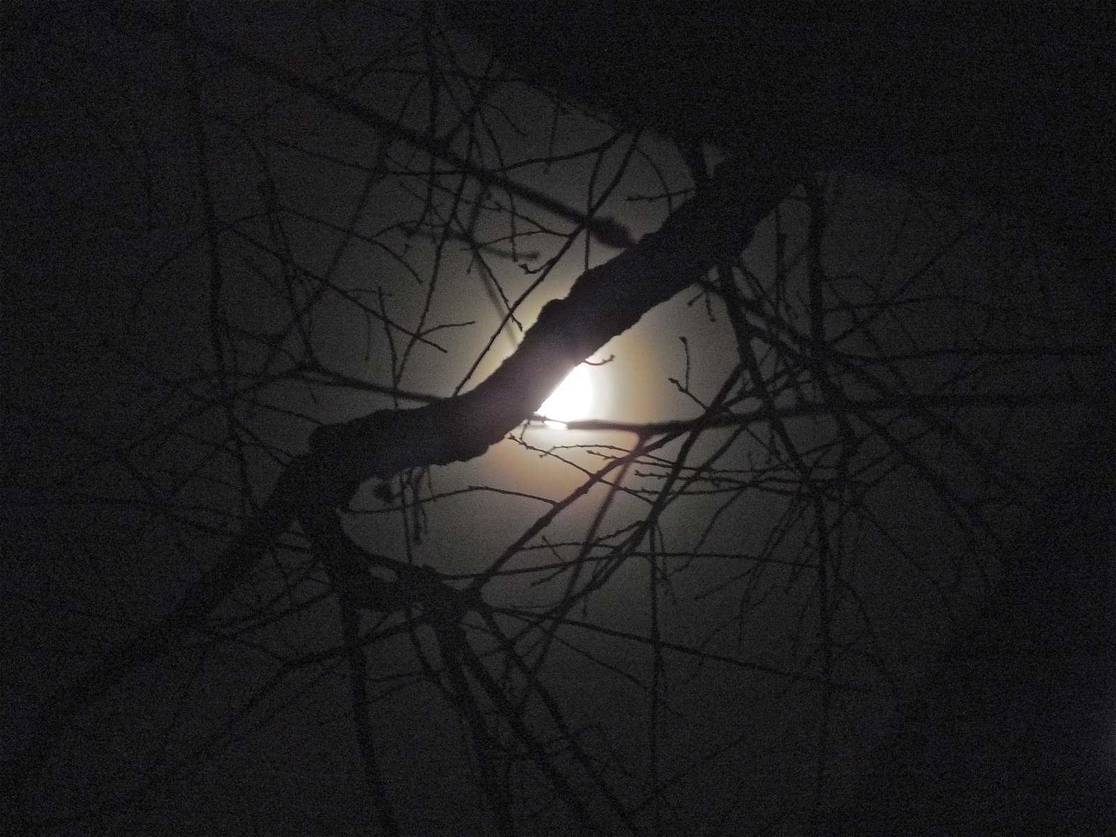 That night I had come in late with the groceries, and was bewitched by the moon as I unloaded them. I was irresistibly drawn back outside to to try my hand at taking a portrait of "old man moon" with my new toy. Below is my photo from January 10th 2012. The moon is in focus behind a branch of a tulip poplar.